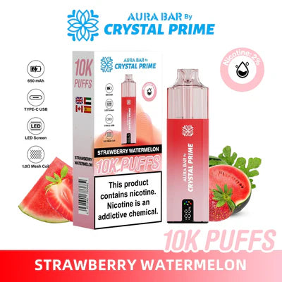 Consequently, you can expect extremely smooth and rich flavor production from this device because it uses a 1.2 Ohm mesh coil. Both vapour productivity and a wide array of 24+ flavors make this product suitable for all users. As a resullt, the Crystal Prime Aura Bar 10000 satisfies users with every draw due to the 2% nicotine strength and its fruity blend and icy menthol flavor combinations which produce a balanced throat experience.